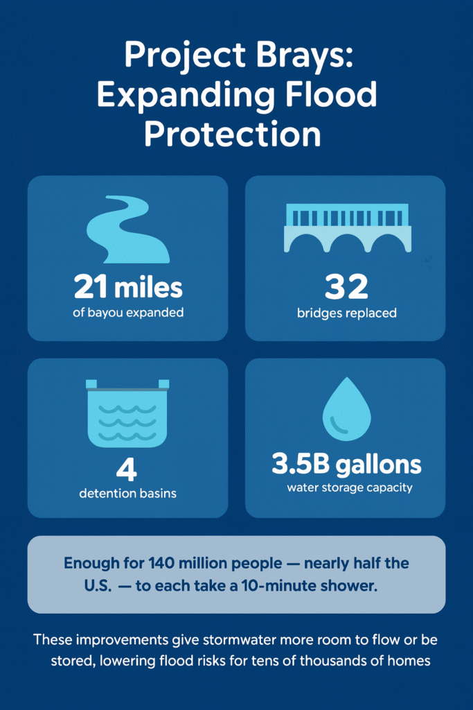 The project widened 21 miles of Brays Bayou from the Houston Ship Channel to Fondren Road and from West Houston Center Boulevard to State Highway 6, replaced or modified 32 bridges (including two pedestrian bridges) to help stormwater move better through channels, and excavated four stormwater detention basins with a combined capacity of approximately 3.5 billion gallons of stormwater.