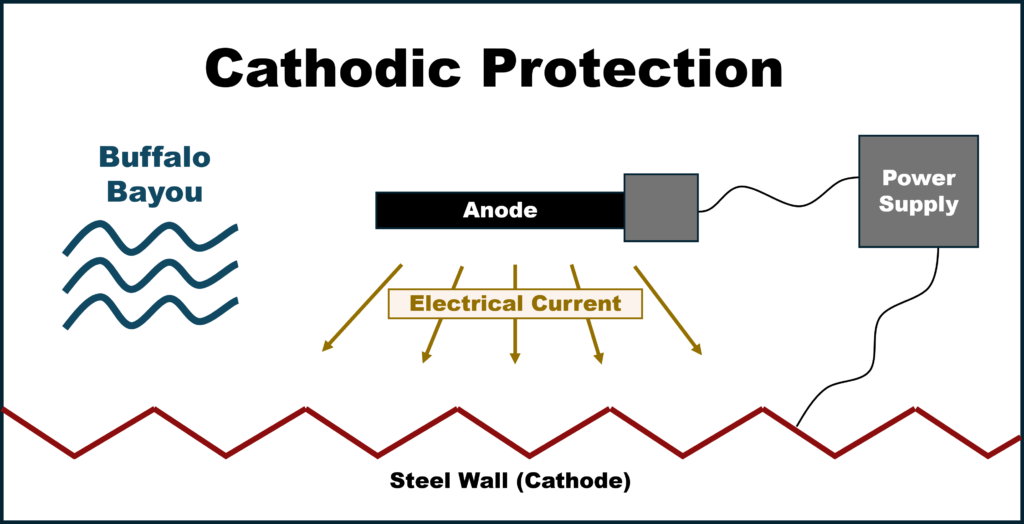 These steel walls have been underwater for more than 30 years. When metal is in water, it naturally starts to corrode. To prevent this, the Flood Control District uses a system called “cathodic protection” that works like a shield for the steel.